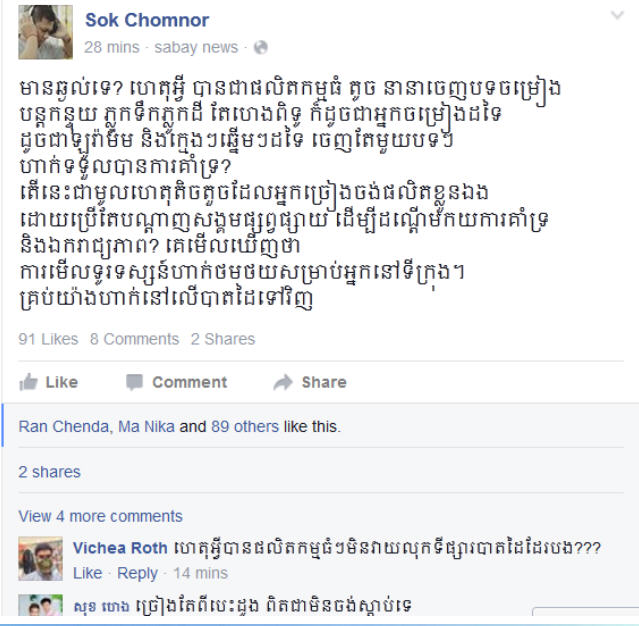 លោក សុខ ជំនោរ បានសរសេរនៅលើហ្វេសប៊ុកទៀតថា តើនេះជាមូលហេតុតិចតូច ដែលអ្នកចម្រៀងចង់ផលិតខ្លួនឯង ដោយប្រើតែបណ្តាញសង្គមផ្សព្វផ្សាយ ដើម្បីដណ្តើមយកការគាំទ្រ និងឯករាជ្យភាព? គេមើលឃើញថា ការមើលទូរទស្សន៍ហាក់ថមថយ សម្រាប់អ្នករស់នៅទីក្រុង។ គ្រប់យ៉ាងហាក់នៅលើបាតដៃទៅវិញ។