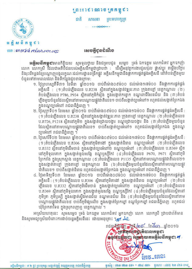 ព័ត៌មានលម្អិតនៃតំបន់ ដែលត្រូវផ្អាកអគ្គិសនីនេះ សូមអានសេចក្តីជូនដំណឹង៖
