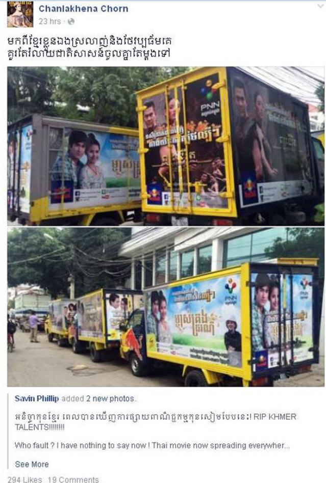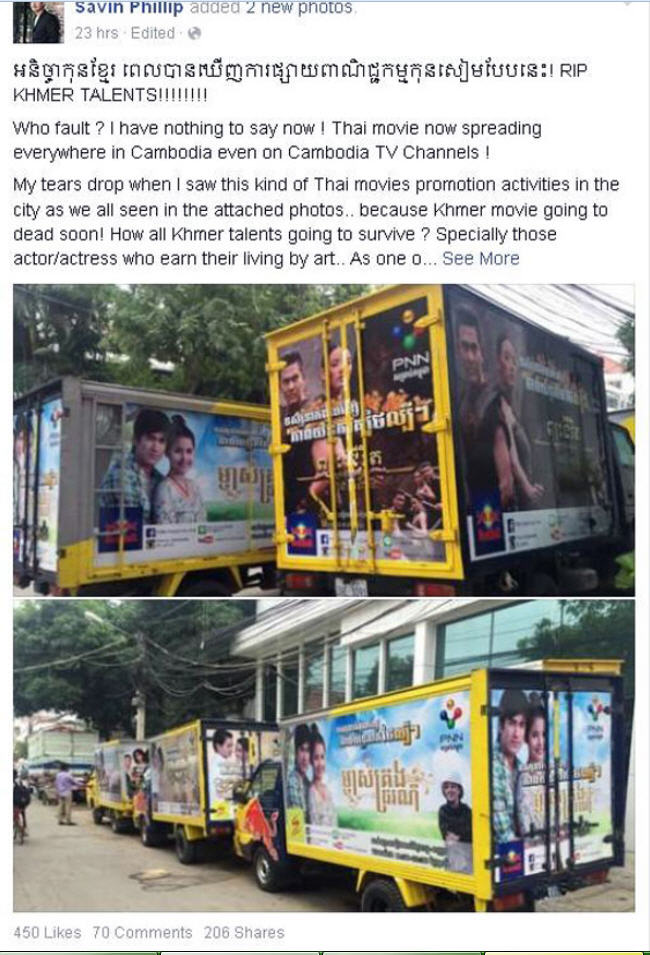 សូមបញ្ជាក់ថា កាលពីពេលថ្មីៗកន្លងទៅនេះ សមាគមសិល្បករខ្មែរ និងសមាគមភាពយន្តកម្ពុជា បានធ្វើបើកកិច្ចប្រជុំ និងលិខិតរួមគ្នាមួយ ផ្ញើជូនប្រមុខរាជរដ្ឋាភិបាល ដើម្បីជួយអន្តរាគមន៍ ពាក់ព័ន្ធទៅនឹងការចាក់បញ្ចាំងរឿង បរទេស ជាពិសេសភាពយន្តភាគថៃ នៅក្នុងម៉ោងមាស តាមបណ្ដាស្ថានីយទូរទស្សន៍ក្នុងស្រុកនានា និងបានផ្ញើលិខិតនោះជូន ក្រសួងវប្បធម៌ និងវិចិត្រសិល្បៈ និង ក្រសួងព័ត៌មានរួចរាល់ហើយដែរ តែនៅមិនទាន់មានដំណោះស្រាយណាមួយ ឆ្លើយតមមកវិញនោះទេ ពោលហាក់បីដូចជាស្ងាត់ដូចចោរលួចសេះអ៊ីចឹង៕