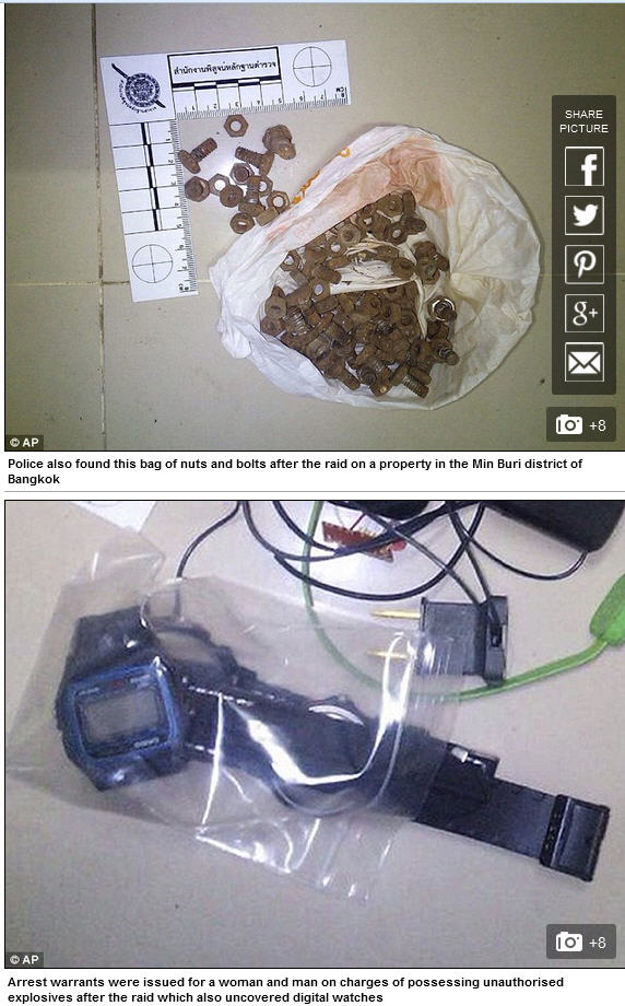 ព្រឹកថ្ងៃអង្គារនេះ ប៉ូលីសថៃ លើកឡើងអោយដឹងថា ខ្លួននឹងប្រគល់ ប្រាក់រង្វាន់ ៣ លានបាត ដល់ ជនណាមួយដែលផ្តល់ជាព័ត៌មានលម្អិត ឈានទៅដល់ការចាប់ឃាត់ ខ្លួន ជនសង្ស័យថ្មី ២ នាក់រូប នេះ ។ ប្រភពបញ្ជាក់ថា ស្ថិតនៅក្នុងវ័យ ២៦ ឆ្នាំ ស្រ្តីថៃម្នាក់និងបុរសជាជនបរទេសម្នាក់ផ្សេងទៀត វ័យប្រមាណ ៤០ ឆ្នាំ ប៉ូលីសកំពុងតែតាមចាប់ឃាត់ខ្លួន បន្ទាប់ពី ករណី វាយឆ្មក់ លុកលុយចូលអា គាររស់នៅរបស់ពួកគេ នៅថ្ងៃ អាទិត្យ កន្លង ទៅនេះ នៅសង្កាត់ Min Buri បានរកឃើញ តឹងតាង ផលិត គ្រាប់បែក មួយ ចំនួន។ យោងតាមអ្នកនាំពាក្យ ប៉ូលីសថៃ លោក Prawut អោយដឹង ថា សំ ណង់អា គារស់នៅខាងលើ គឺជួលស្នាក់នៅដោយ ស្រ្តីថៃ ឈ្មោះ Wanna Suansun ។
