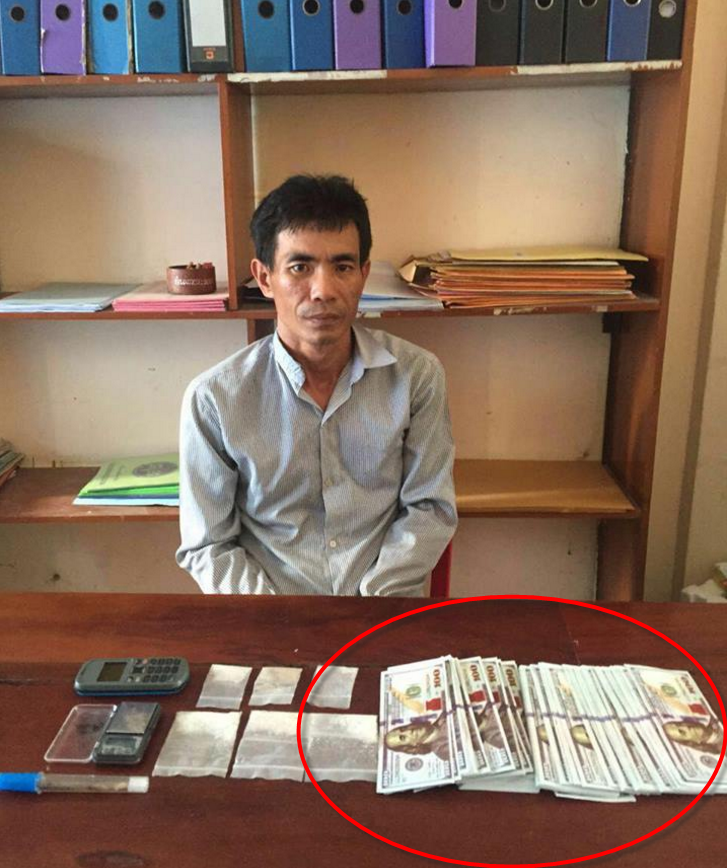 លោកបន្ដ ការឃាត់ខ្លូននេះធ្វើឡើង ខណៈពេលជនសង្ស័យ យកក្រដាសប្រាក់ប្រភេទ១០០ដុល្លារ (លុយសែន) ទៅដូរនៅកន្លែងដូរ លុយមួយ ក្រោយមកកម្លាំងរបស់លោកបានធ្វើការឆែកឆេរលើខ្លួនរបស់ជនសង្ស័យ រកឃើញគ្រឿងញៀនប្រភេទ ម៉ាទឹកកក៦កញ្ចប់ មានទម្ងន់១៤,៤៤ ក្រាម ជញ្ជីងសម្រាប់ថ្លឹងគ្រឿងញៀន១គ្រឿង ទែម៉ូម៉ែត្រសម្រាប់ប្រើប្រាស់គ្រឿងញៀន១ និងក្រដាសប្រាក់ដុល្លារ ក្លែងក្លាយ១០០សន្លឹក ផងដែរ។