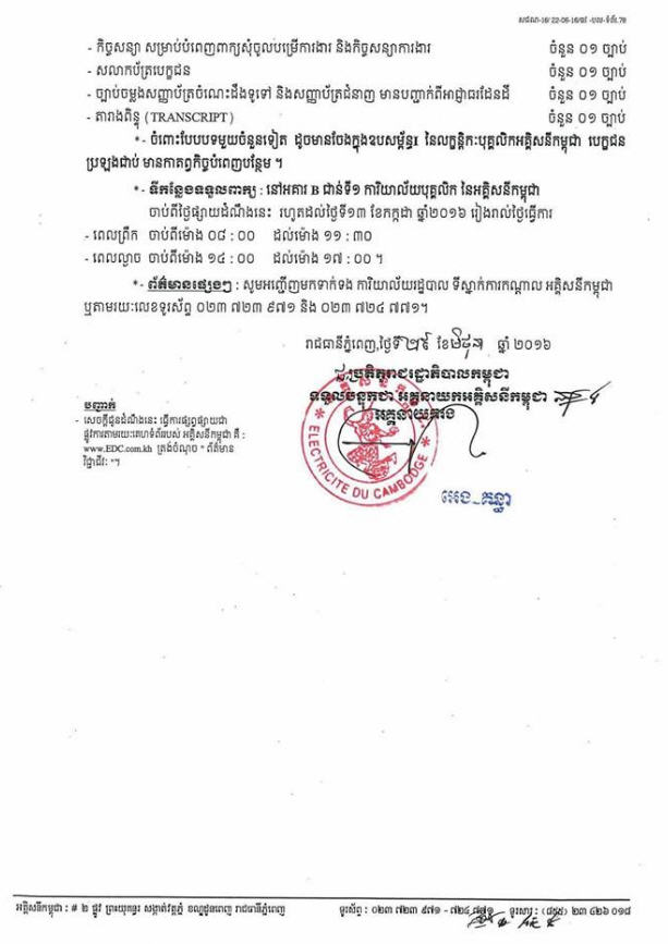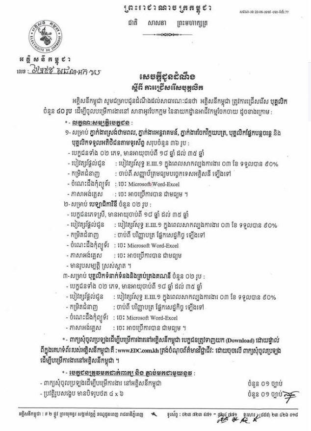 ឱកាសការងារជាច្រើនកន្លែងនៅអគ្គិសនីកម្ពុជា នៅសាខាអូរបែកក្អម នៃនាយកដ្ឋានអាជីវកម្មចែកចាយ។