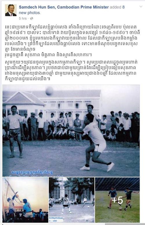 សូមជំរាបថា នៅថ្ងៃទី១២ ខែធ្នូ ឆ្នាំ២០១៥នេះ សម្តេចតេជោ ហ៊ុន សែន នាយករដ្ឋមន្រ្តី នៃកម្ពុជា បានបង្ហោះរូបភាពលេងកីឡាកាលពីវ័យកណ្តាល ហើយអំពាវនាវឱ្យយុវជន និងប្រជាពលរដ្ឋទាំងអស់គ្នា ចូលរួមលេងកីឡា និងហាត់ប្រាណដើម្បីសុខភាព។