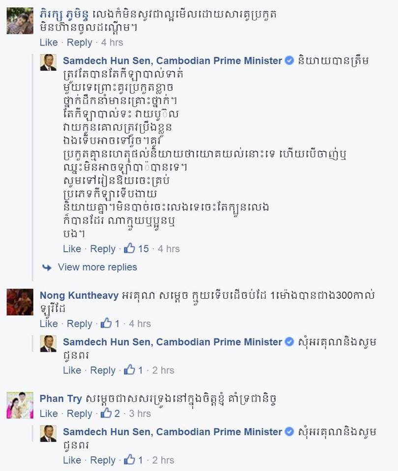 ពាក់ព័ន្ធនឹងការ Comment នេះ សម្តេចតេជោ ហ៊ុន សែន បានលើកឡើងឆ្លើយតបថា «តែកីឡាបាល់ទះវាយប៊ូល វាយកូនគោលត្រូវប្រឹងខ្លួនឯងទើបអាចទៅរួច។ គូរប្រកួតគ្មានហេតុផលនិយាយថា យោគយល់នោះទេ ហើយបើចាញ់ឬឈ្នះមិនអាចឡាំប៉ា បានទេ។ សូមទៅរៀនឱយចេះគ្រប់ប្រភេទ កីឡាទើបងាយនិយាយគ្នា។ មិនបាច់ចេះលេងទេចេះតែក្បួនលេង ក៏បានដែរណាក្មួយឬប្អូនឬ បង»។