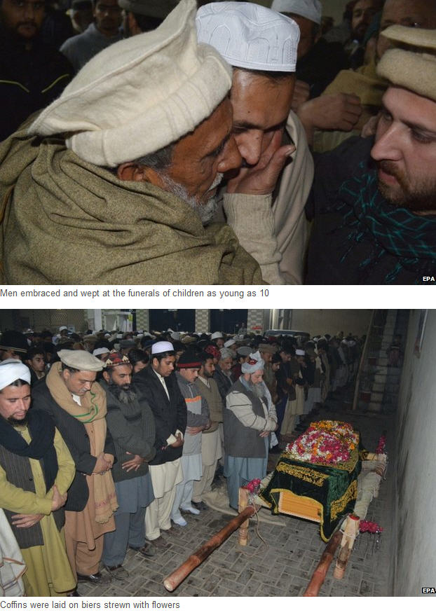 ព័ត៌មានអន្តរជាតិ ៖ ទីក្រុង Peshawar ប្រទេស ប៉ាគីស្ថាន បានចាប់ផ្តើមប្រារព្ធកម្មវិធីបុណ្យសពដោយ មានការបញ្ជុះសព ជនរងគ្រោះស្លាប់បាត់បង់ជីវិត ក្រោយពីមានការវាយប្រហារ ពីសំណាក់ក្រុមឧទ្ទាម តាលីបង់ទៅលើសាលារៀនមួយកន្លែង សម្លាប់សិស្សសាលាតូច ហោចណាស់ ១៣២ នាក់និងបុគ្គលិក ៩ នាក់ផ្សេងទៀត ។