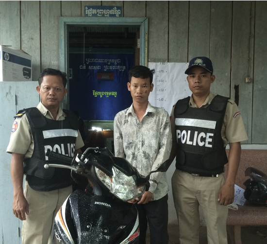 ព្រះសីហនុ ៖ ជនសង្ស័យម្នាក់ ត្រូវបាន នគរបាលស្រុកព្រៃនប់ ខេត្ដព្រះសីហនុ ចាប់ខ្លួន ក្រោយពីរូប គេបានស៊ីដាច់ម៉ូតូមិត្ដ ភក្ដិមួយគ្រឿង នៅពេលដែលកំពុងផឹកស៊ី ហើយសុំខ្ចីជិះទៅខ្ចីលុយពីគេ កាលពី ល្ងាចថ្ងៃទី២៥ ខែឧសភា ឆ្នាំ២០១៥ ស្ថិតនៅភូមិពូធឿង ឃុំបិតត្រាង ស្រុកព្រៃនប់ ។