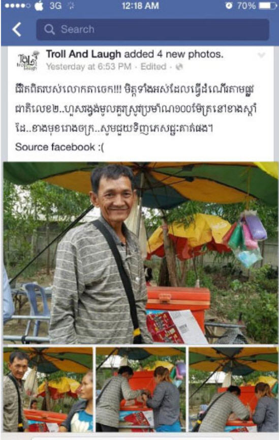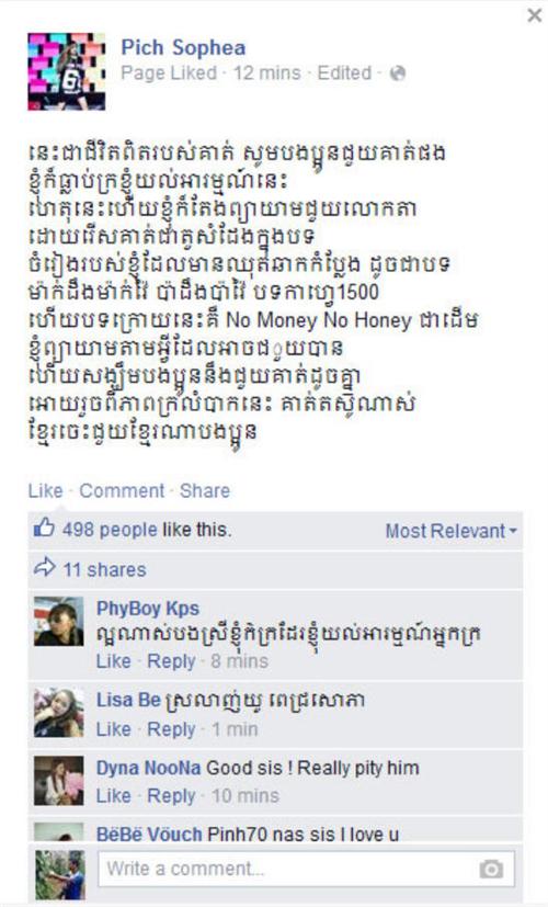 នៅក្នុងសារនោះ នាងបានសរសេរបែបអំពាវនាវ ទៀតថា «សូមបងប្អូនជួយគាត់ផង ជួយគាត់ឲ្យរស់នៅរួច ផុតពីការលំបាក គាត់តស៊ូណាស់ ខ្មែរចេះជួយខ្មែរ ហើយម្យ៉ាងទៀត ខ្ញុំក៏ធ្លាប់ក្រ ខ្ញុំយល់អារម្មណ៍នេះ ហេតុនេះ ខ្ញុំព្យាយាមជួយគាត់ ហើយដូច្នេះ បងប្អូនសប្បុរសជន សុំមេត្តាជួយគាត់ផងចុះ»។
