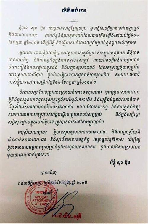 ខាងក្រោមនេះ ជាលិខិតចំហររបស់លោក សុខ ប៊ុន