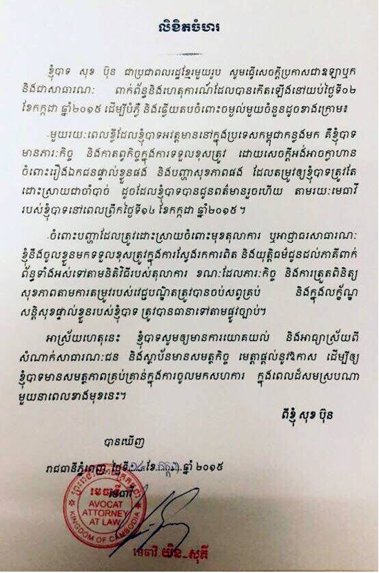 ក្នុងលិខិតចំហរ លោក សុខ ប៊ុន បានសរសេរថា «មួយរយៈពេលខ្លី ដែលខ្ញុំបាទអវត្តមាននៅក្នុងប្រទេសកម្ពុជាកន្លងមក គឺខ្ញុំបាទមានភារៈកិច្ច និងកាតព្វកិច្ចក្នុងការទទួលខុសត្រូវ ដោយសេចក្តីអង់អាចក្លាហានចំពោះរឿងឯកជនផ្ទាល់ខ្លួនផង និងបញ្ហាសុខភាពផង។ មួយវិញទៀត ចំពោះបញ្ហាដែលត្រូវដោះស្រាយចំពោះមុខតុលាការ ឬអាជ្ញាធរសាធារណៈ ខ្ញុំនឹងចូលខ្លួនមកទទួលខុសត្រូវក្នុងការស្វែងរកការពិត និងយុត្តិធម៌ជូនដល់ភាគីពាក់ព័ន្ធទាំងអស់ទៅតាមនិតិវិធិរបស់តុលាការ”