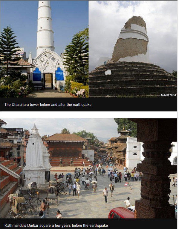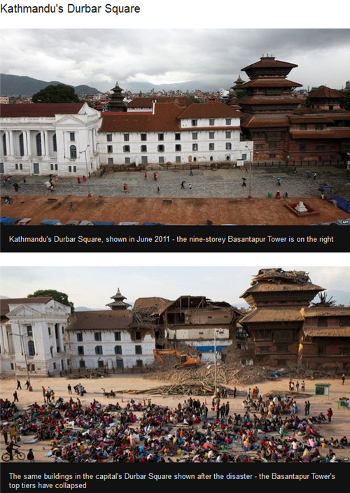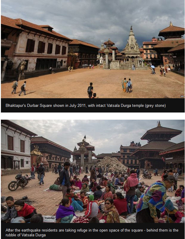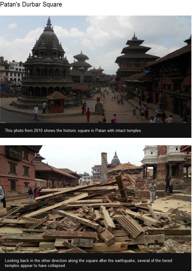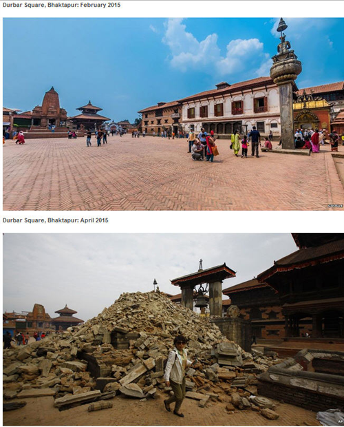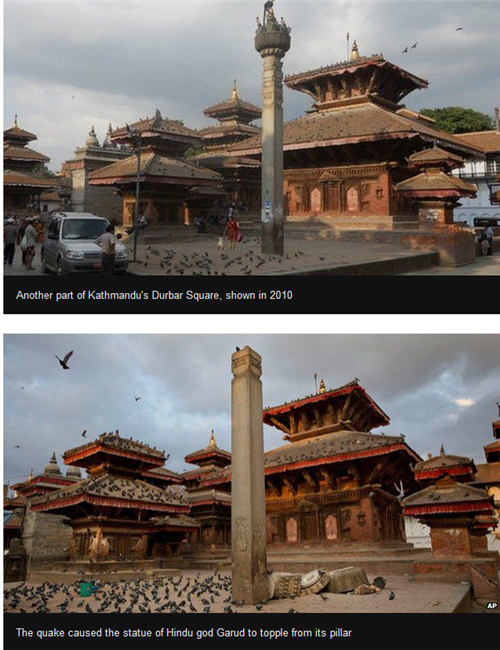 លោកស្រី Irina Bokova អគ្គនាយកជាន់ខ្ពស់នៃអង្គការសហ ប្រជាជាតិ ទទួលបន្ទុកសម្បត្តិវប្បធម៌ នោះ អោយដឹងថា ៖ មានការខូចខាតជាច្រើន និងទំហំធំ ទៅ លើបណ្តាទីរមណីយដ្ឋាន សម្បត្តិវប្ប ធម៌ ពិ ភពលោក នៅឯជ្រលងទីក្រុងធំបំផុត របស់នេប៉ាល់ ទី ក្រុង Kathmandu គួរបញ្ជាក់ថាមាន សំណង់ អច្ឆិរយៈដល់ទៅ ៧ កន្លែង ពីជ្រលង ខាង លើ ត្រូវ ចាត់ ចូលជាសម្បត្តិបេតិកភណ្ឌពិភព លោក ក្នុង សំណង់អច្ឆរិយៈ ៣ មាននៅវាល Durbar ។ លោក ស្រី អ គ្គនាយកដដែលរូបនេះ បន្ត អោយដឹងថា សំណង់អច្ឆរិយៈទាំង ៣ កន្លែងនេះ រងនូវការបំផ្លិចបំផ្លាញស្ទើរទាំងស្រុង ។