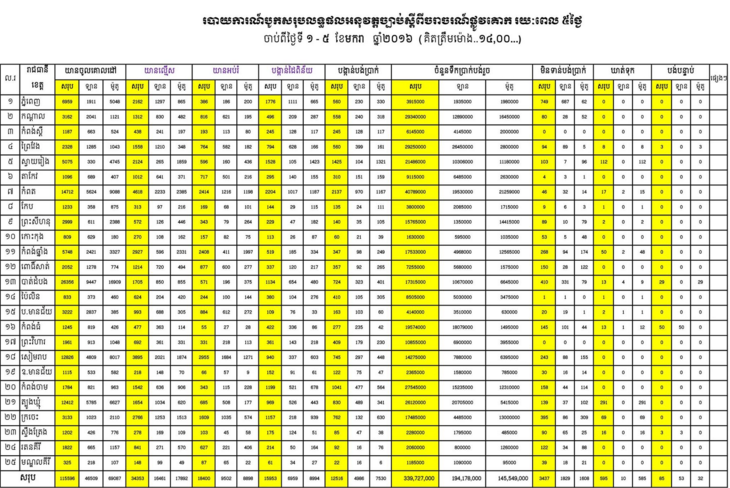 (ភ្នំពេញ)៖ គិតត្រឹមថ្ងៃ០១ ដល់ថ្ងៃ០៥ ខែមករា ឆ្នាំ២០១៦ កម្លាំងនគរបាលចរាចរណ៍ បានផាកពិន័យថវិកា បានជិត ៣៤០លានរៀលនៅទូទាំងប្រទេស។ នេះបើយោងតាមរបាយការណ៍របស់បូកសរុបលទ្ធផលអនុវត្តច្បាប់ស្តីពីចរាចរណ៍ផ្លូវគោក។