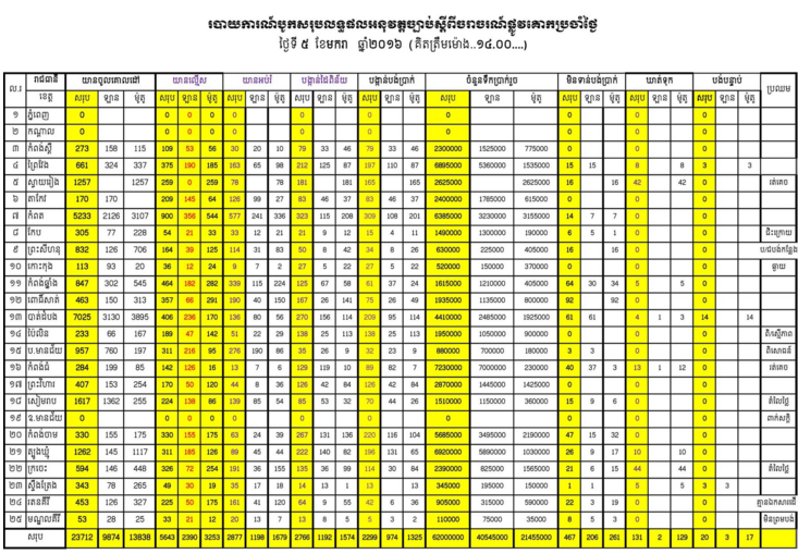សូមបញ្ជាក់ថា សម្រាប់ការផាកពិន័យនៅថ្ងៃទី០៥ ខែមករា ឆ្នាំ២០១៦ វិញ គឺមាន ៦២,០០០,០០០រៀល បានពីការផាកឡាន ៤០,៥៤៥,០០០រៀល និង បានពីការផាកម៉ូតូ ២១,៤៥៥,០០០រៀល។ នេះបើយោងតាមរបាយការណ៍បូកសរុបលទ្ធផលអនុវត្តច្បាប់ស្តីពីចរាចរណ៍ផ្លូវគោកប្រចាំថ្ងៃ។