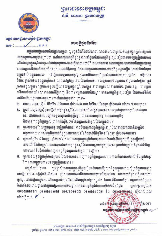 សូមអានសេចក្តីជូនដំណឹងរបស់អគ្គនាយកដ្ឋានគយ និងរដ្ឋាករកម្ពុជា ដែលចេញផ្សាយកាលពីថ្ងៃទី១១ ខែមករា ឆ្នាំ២០១៦ម្សិលមិញ៖