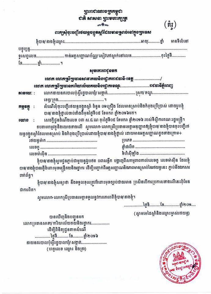 (ភ្នំពេញ)៖ អគ្គនាយកដ្ឋានគយ និងរដ្ឋាករកម្ពុជា បានប្រកាសឲ្យម្ចាស់យានយន្តចង្កូតស្តាំងទាំងអស់ ចូលទៅបង់ពន្ធ និងចុះបញ្ជី រថយន្ត ដោយមិនចាំបាច់កែចង្កូត ដើម្បីទទួលបានផ្លាកលេខ និង ប្រើប្រាស់ដោយស្របច្បាប់។