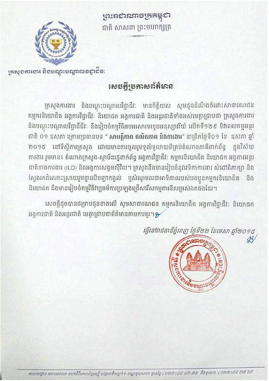 ភ្នំពេញ៖ ក្រសួងការងារ និងបណ្តុះបណ្តាលវិជ្ជាជីវៈ បានប្រកាសពីការរៀបចំ វេទិកាការងារមួយ នៅ ក្នុងទិវាពលកម្មអន្តរជាតិ ថ្ងៃទី១ ខែឧសភា ខាងមុខនេះ សម្តៅពិភាក្សា និងស្វែងរកដំណោះស្រាយ រួមគ្នា លើបញ្ហាកង្វល់ ឬសំណូមពរជាអាទិភាព របស់បងប្អូនកម្មករនិយោជិត និងនិយោជក រួមទាំងរៀប ចំ កម្មវិធីវប្បធម៌ ការប្រឡងជ្រើសរើសកម្មការិនីសម្រស់ឯក ប្រចាំឆ្នាំផងដែរ។ សូមអានលិខិតរបស់ក្រសួងការងារដូចខាងក្រោម៖