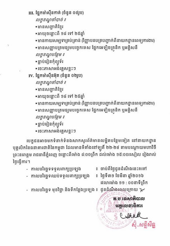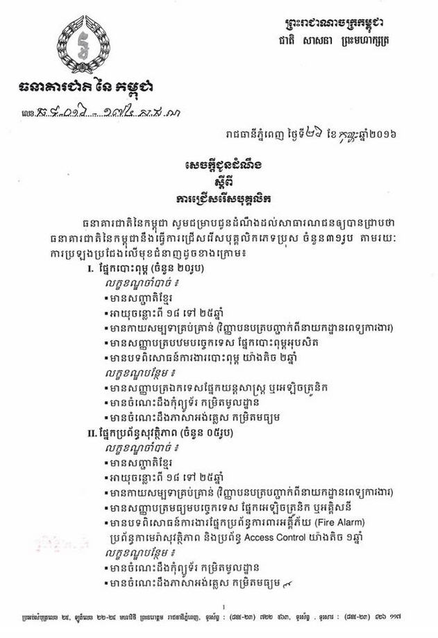 (ភ្នំពេញ)៖ ធនាគារជាតិនៃកម្ពុជា បានចេញសេចក្តីជូនមួយ ស្តីពីការជ្រើសរើសបុគ្គលិកភេទប្រុសចំនួន ៣១នាក់ តាមរយៈការ ប្រឡងលើមុខវិជ្ជា ផ្នែកបោះពុម្ភៈចំនួន២០រូប ផ្នែកប្រព័ន្ធសុវត្ថិភាព ចំនួន៥នាក់ ផ្នែកម៉ាស៊ីនកាត់៤នាក់ និងផ្នែកម៉ាស៊ីនអ៊ុត ចំនួន២នាក់៕