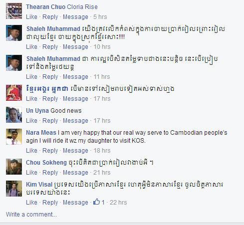 មតិយោបល់របស់ប្រជាពលរដ្ឋ និងប្រិយមិត្តអ្នកអានជាច្រើនត្រូវបាន បង្ហាញឡើងតាមរយៈ Facebook Page របស់អង្គភាពព័ត៌មាន ដោយភាគីច្រើនយល់ឃើញថា តម្លៃសំបុត្រគួរតែថោកជាងនេះ ដើម្បីជួលប្រជាពលរដ្ឋក្រីក្រ ខណៈដែលរថយន្តឈ្នួលប្រហាក់ហែលនេះ តែចំណាយពេលតិចជាងនេះ។