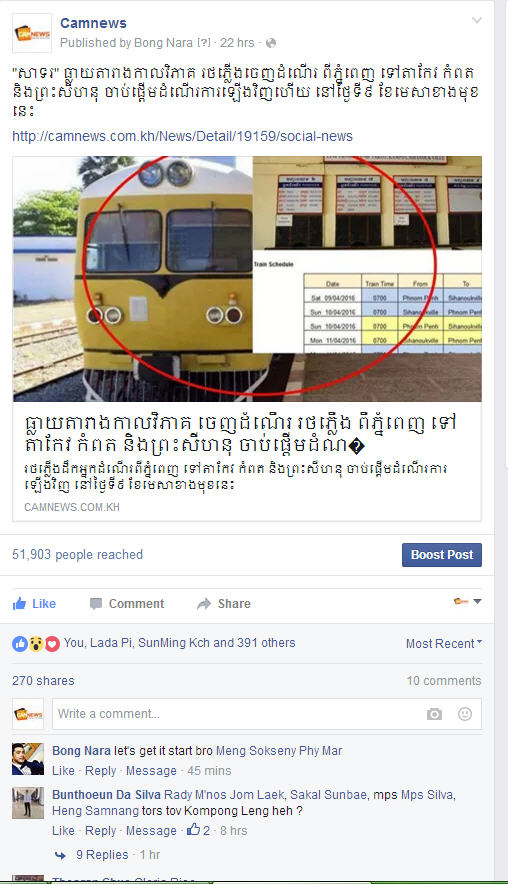 (ភ្នំពេញ)៖ នៅថ្ងៃម្សិលមិញ អង្គភាពព័ត៌មាន Freshnews បានចេញផ្សាយនូវអត្ថបទមួយ ដែលមានចំណងជើងថា «រថភ្លើងដឹកអ្នកដំណើរ ពីភ្នំពេញទៅតាកែវ កំពត និងព្រះសីហនុ ចាប់ផ្ដើមដំណើរការឡើងវិញ នៅថ្ងៃទី៩ ខែមេសា ខាងមុខនេះ» ដោយក្នុងអត្ថបទមានរំលេចនូវ តម្លៃនៃការធ្វើដំណើរតាមរថភ្លើង ដោយពីភ្នំពេញ ទៅខេត្តតាកែវ សំបុត្រថ្លៃ៥ដុល្លារ ពីភ្នំពេញទៅខេត្តកំពតថ្លៃ៦ដុល្លារ និងពីភ្នំពេញទៅខេត្តព្រះសីហនុតម្លៃ៧ដុល្លារ។ ក្រោយចុះផ្សាយរួចមក មានប្រជាពលរដ្ឋ ក៍ដូចជាប្រិយមិត្តអ្នកអានយ៉ាងច្រើនបានសាទរ នៃការដាក់ដំណើររថភ្លើងអ្នកដំណើរឡើងវិញនេះ ប៉ុន្តែពួកគាត់បានយល់ឃើញថា តម្លៃសំបុត្រធ្វើដំណើរនេះ ហាក់ដូចជាថ្លៃជ្រុល និងសុំមានការពិចារណាឡើងវិញ។