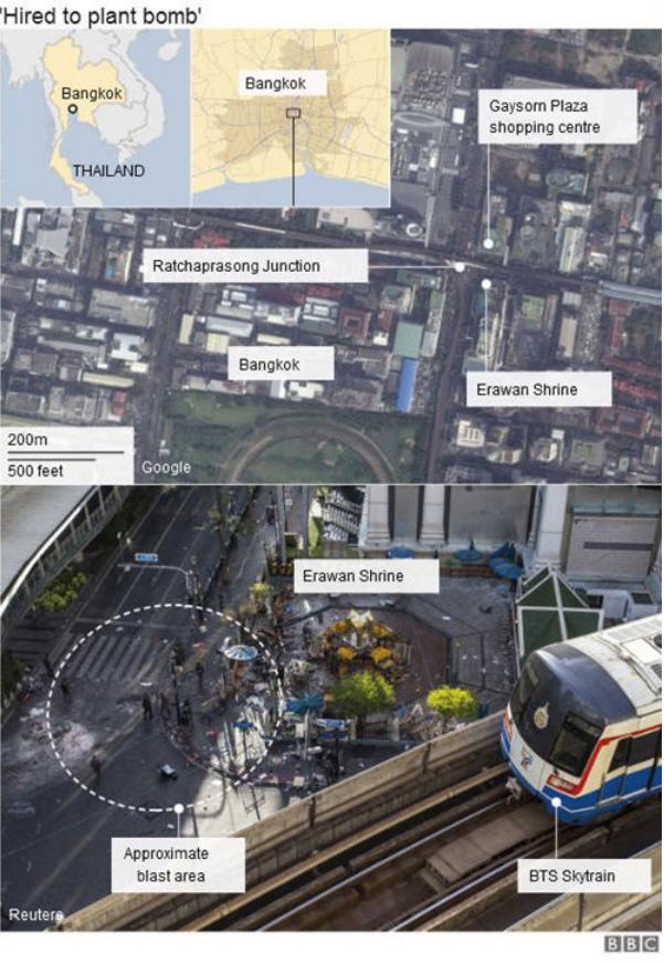 អ្នកនាំពាក្យអោយរដ្ឋាភិបាល យោធា ប្រទេសថៃ បានឡើងអោយដឹងថា បរិបទនៃការលើកឡើង ខាងលើអ អាចធ្វើទៅបានបន្ទាប់ពីសេចក្តីសម្រេចចិត្ត ជាបឋម ដោយ ក្រុមអ្នកស៊ើបអង្កេត ។ គួរ បញ្ជាក់ថា ករណីបំផ្ទុះគ្រាប់បែក នៅឯទីសក្ការៈ Erawan ភាគ កណ្តាល ក្រុង បាងកក នារាត្រីថ្ងៃ ច័ន្ទនោះ បានសម្លាប់ មនុស្សតិចបំផុត ២០ នាក់ និងច្រើននាក់ផ្សេងទៀត រងរបួស។ មន្រ្តីប៉ូលីស បានដាក់បន្ទុកនៃការសង្ស័យរបស់ខ្លួន ទៅលើក្រុមឧក្រិដ្ឋជន ១០ នាក់ ថាបានចូលរួម ការបំផ្ទុះ គ្រាប់បែកអត្តឃាតលើកនេះ ។