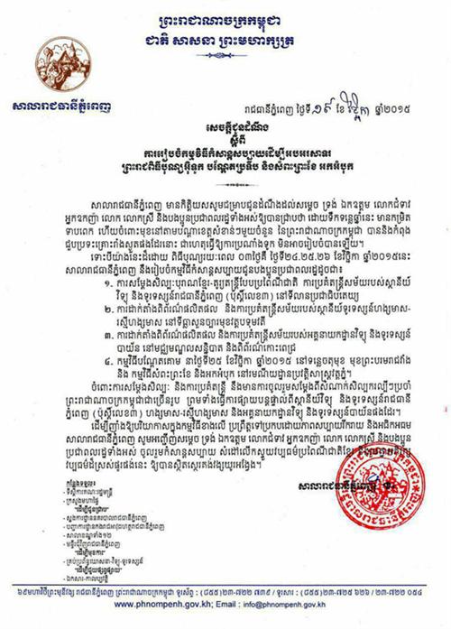 ភ្នំពេញ៖ សាលារាជធានីភ្នំពេញ នៅថ្ងៃទី១៩ ខែវិច្ឆិកា ឆ្នាំ២០១៥នេះ បានចេញសេចក្តី ជូនដំណឹងមួយ ដោយ បញ្ជាក់ពីទីតាំង និងការរៀបចំកម្មវិធី កម្សាន្តសប្បាយ ដើម្បីអបអរសាទរ ព្រះរាជពិធីបុណ្យអុំទូក បណ្តែតប្រទើប និងសំពះព្រះខែ អកអំបុក រយៈពេល៣ថ្ងៃ ចាប់ពីថ្ងៃទី២៤-២៥-២៦ ខែវិច្ឆិកា ឆ្នាំ២០១៥ ដែលនឹងចូលមកដល់ នៅពេលដ៏ខ្លីខាងមុខនេះ បើទោះបីការប្រណាំទូក មិនអាចរៀបចំបានក៏ដោយ។