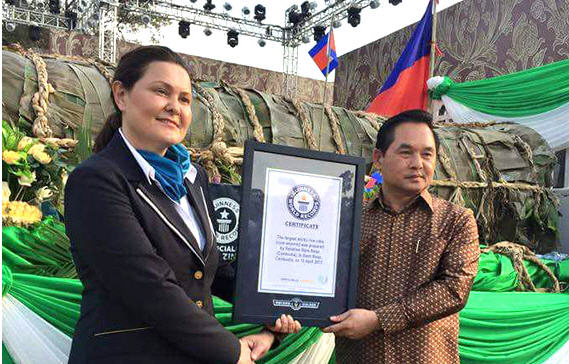 នំអន្សមយក្សរបស់ខ្មែរ ដែលមានទម្ងន់ប្រមាណ ៣,២តោនពេលមិនទាន់ចម្អិន និងមានទម្ងន់រហូតដល់ជាង ៤ តោនក្រោយចំអិនរួចរាល់នោះ ត្រូវបានលោកស្រី Seyda Subasi Gemici តំណាងស្ថាប័ន Guinness World Records ប្រកាសដាក់បញ្ចូលក្នុងកំណត់ត្រាពិភពលោកនារសៀលថ្ងៃនេះ បន្ទាប់ពីបានវាយតម្លៃយ៉ាងល្អិតល្អន់ ទៅលើទម្ងន់ រស់ជាតិនំ ជាមួយនិងគ្រឿងផ្សំ ព្រមទាំងគុណភាពនំផងដែរ។ លោកស្រី Seyda Subasi Gemici បានថ្លែងថា នំអន្សម របស់កម្ពុជា មានទម្ងន់ធ្ងន់ជាងគេលើពិភពលោក។