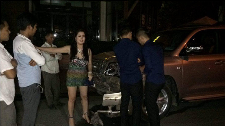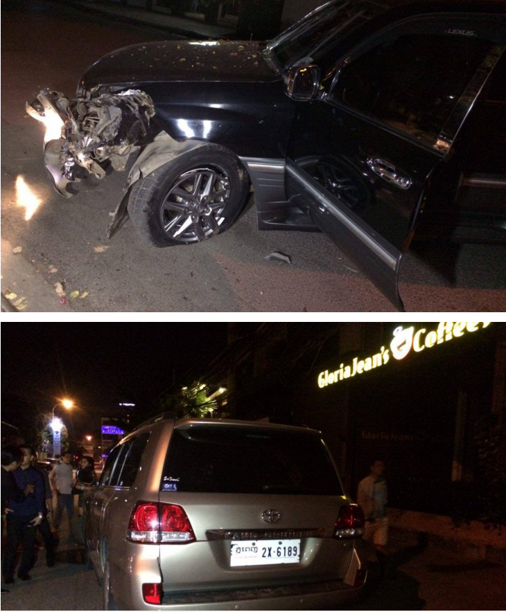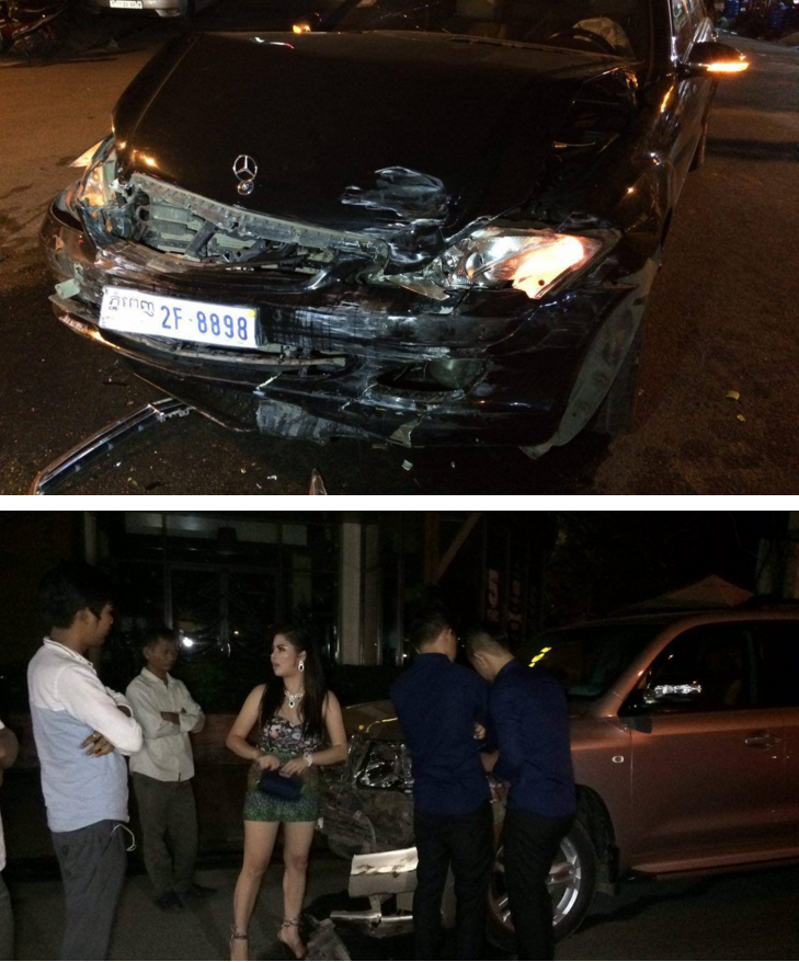 ព័ត៌មានពីកន្លែងកើតហេតុបានប្រាប់ឲ្យដឹងថា នៅវេលាម៉ោងខាងលើគេបានឃើញបុរសម្នាក់រួម និងស្ត្រីម្នាក់បានបើករថយន្ត Mercedes សេរី S350 ពណ៌ខ្មៅស្លាកលេខភ្នំពេញ 2F-8898 បើកលើផ្លូវ ៣១០ទិសដៅ ពីកើតទៅលិចក្នុងល្បឿនយ៉ាងលឿន លុះបើកមកដល់ផ្លុវកែងមិនបានបង្អន់ល្បឿនធ្វើឲ្យរថយន្ត Lexus RX330 ពណ៌ស មិនចាំស្លាកលេខ ដែលបើកលើផ្លូវ១១៣ ក្នុងទិសដៅពីត្បូងទៅជើង ចេញមកដល់ដែរ បានបុកគ្នាពេញទំហឹងជាមួយរថយន្ត Mercedes នោះ ហើយរថយន្ត Lexus ក៌បានជ្រុលទៅបុក និងម៉ូតូ Scoopy មួយគ្រឿង ដែលជិះដោយស្ត្រីពីរនាក់ទៀត ដែលបើកលើផ្លូវ១១៣ ទិសដៅពីជើងទៅត្បូងយ៉ាងពេញទំហឹងដែរ ដែលបណ្តាលឲ្យស្ត្រីម្នាក់ក្នុងចំណោមពីរនាក់ រងរបួសធ្ងន់ធ្ងរ ហើយត្រូវបានរថយន្តដឹកទៅសង្គ្រោះអាយុជីវិតភ្លាមៗផងដែរ។