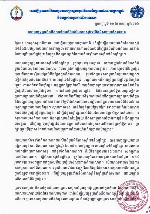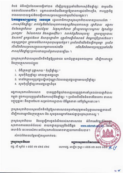 ព័ត៌មានលំអិតសូមអានសេចក្តីប្រកាសព័ត៌មាន រួមរបស់ក្រសួងសុខាភិបាល និងអង្គការសុខភាពពិភពលោក៖