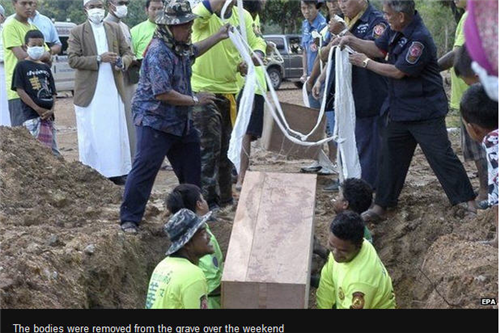 សេចក្តីរាយការណ៍ អោយដឹងថា ផ្នូរជាច្រើនកន្លែងត្រូវបានរកឃើញ ខណៈផ្ទុកសាកសព ដល់ទៅ ២៦ នាក់ កាលពីសប្តាហ៍កន្លងទៅនេះ នៅជុំរុំព្រៃជ្រៅ ដែលគេបោះបង់ចោល មានទីតាំង ជិតទៅ នឹងព្រំប្រទល់ដែន ប្រទេស ម៉ាឡេស៊ី ។ ប្រភពដដែលបន្តអោយដឹងថា ផ្លូវត្រាច់ចរ ក្នុងព្រៃ កាត់ជុំរុំ ព្រៃជ្រៅមួយនេះ ជាធម្មតា ត្រូវបានប្រើប្រាស់ ពីសំណាក់ ក្រុមជនជាតិអ៊ីស្លាម Rohingyaគេចចេញ ពីការធ្វើទុក្ខទោម្នេញ នៅក្នុងប្រទេស មីយ៉ាន់ម៉ា ។ មន្រ្តីផ្លូវការ មានជំនឿជាក់អោយ ដឹង ថា បណ្តា ជនអន្តោប្រវេសន៍ ត្រូវបានរងគ្រោះ ពីសំណាក់អ្នក ជួយដូរ ដែល ជាអ្នកទាមទារសំណង សម្រាប់ ក្រុមគ្រួសារ របស់ពួកគេ ។ មន្រ្តីប៉ូលីស គូសបញ្ជាក់អោយ ដឹងថា ៖ ជនសង្ស័យជនជាតិ ថៃ ត្រូវ បានចាប់ឃាត់ខ្លួន អំឡុង ថ្ងៃ ច័ន្ទ ដើម សប្តាហ៍នេះ ក្នុងនោះ ក៏ មាន ការចាប់ឃាត់ខ្លួន ដូចគ្នាដែរ សមាជិកក្រុមប្រឹង្សាជាតិ មកពី ខេត្ត Songkhla ជាខេត្តដែលផ្នូរជាច្រើនត្រូវបានរកឃើញ ។