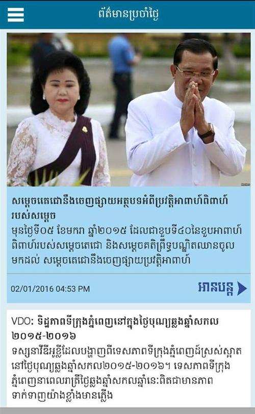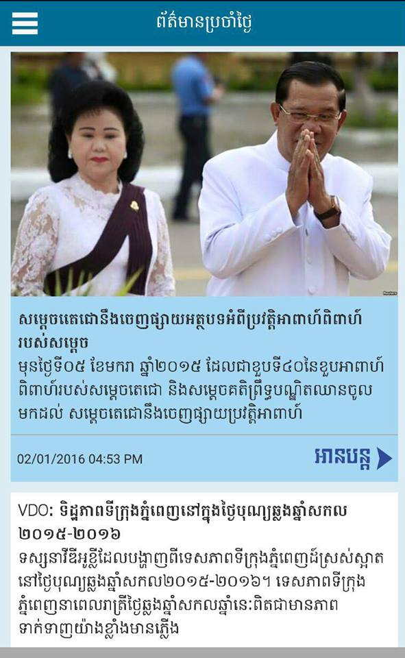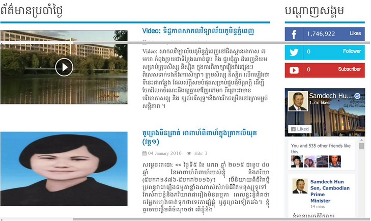 (ភ្នំពេញ)៖ បន្ទាប់ពីទទួលបានជោគជ័យយ៉ាងខ្លាំងនៅលើ Facebook អំពីសកម្មភាពព័ត៌មានរបស់ប្រមុខរាជរដ្ឋាភិបាលកម្ពុជា សម្តេចតេជោ ហ៊ុន សែន ឥឡូវនេះសម្តេចតេជោ បានបង្កើត និងដាក់ដំណើរជាផ្លូវការនូវគេហទំព័រ និងកម្មវិធីទទួលព័ត៌មាន (Website & App) ចាប់ពីថ្ងៃទី០៥ ខែមករា ឆ្នាំ២០១៦នេះ ដើម្បីងាយស្រួលឲ្យបងប្អូនប្រជាពលរដ្ឋចូលមើល និងតាមដានរាល់ព័ត៌មានថ្មីៗ ស្តីពីសកម្មភាពដឹកនាំរបស់រដ្ឋាភិបាលកម្ពុជា។