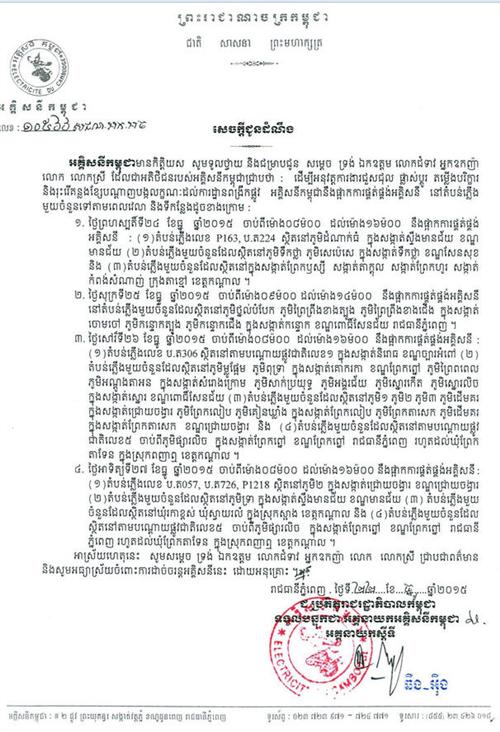 (ភ្នំពេញ)៖ អគ្គិសនីកម្ពុជា បានចេញសេចក្តីជូនដំណឹងមួយ ដោយបញ្ជាក់ពីការផ្អាកផ្គត់ផ្គង់ ចរន្តអគ្គិសនីនៅតំបន់មួយចំនួន ក្នុងរាជធានីភ្នំពេញ និងខេត្តកណ្តាល ចាប់ពីថ្ងៃទី២៤ ដល់ថ្ងៃទី ២៧ ខែធ្នូ ឆ្នាំ២០១៥ ដើម្បីធ្វើការជួសជុល ផ្លាស់ប្តូរដំឡើងបរិក្ខារ និងរុះរើគន្លងខ្សែបណ្តាញ បង្កលក្ខណៈដល់ការដ្ឋានពង្រីកផ្លូវជាដើម៕