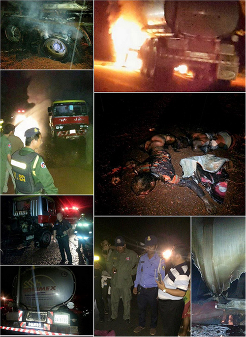 ព្រះសីហនុ៖ បុរសពីរនាក់ បានឆេះរោលពេញខ្លួន និងស្លាប់ភ្លាមៗ នៅនឹងកន្លែងកើតហេតុ បន្ទាប់ពីបានបើកម៉ូតូធំ ត្រៃ បុកជាមួយរថយន្តដឹកប្រេងរបស់ក្រុមហ៊ុន Sokimex នៅលើកំណាត់ផ្លូវជាតិលេខ៤ ត្រង់ចំណុចគីឡូម៉ែត្រ ២០៥ ជិតស្ពានទឹកសាប ក្នុងឃុំរាម ស្រុកព្រៃនប់ ខេត្តព្រះសីហនុ នាម៉ោង១០ និង៤០នាទីយប់ថ្ងៃទី២៥ ខែឧស ភា ឆ្នាំ២០១៥។