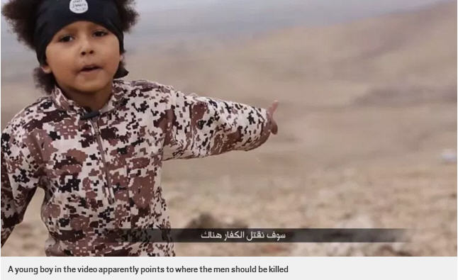 គួរបញ្ជាក់ថា វិនាទីចុងក្រោយនៃឃ្លីបបាញ់សម្លាប់ បុរស ៥ នាក់ រងនូវការចោទ ប្រកាន់ថា ជាក្រុម ចារកម្មពីប្រទេសអង់គ្លេសនោះ គេឃើញមានក្មេងប្រុសម្នាក់ អាយុប្រមាណ ៧ ទៅ ៨ ឆ្នាំ ចេញមុខ ចង្អុយបង្ហាញគូសបញ្ជាក់ ពីទីតាំង ដែលត្រូវសម្លាប់ ក្រុមចារកម្មទាំង ៥ នាក់។ ប្រភពអោយដឹងថា ISIS ជាធម្មតា តែងតែ បញ្ជៀប មនោគមវិជ្ជា ដល់ក្មេង ជំនាន់ក្រោយ អោយ ក្លាយជាក្រុមសកម្ម ប្រយុទ្ធ ខណៈកាលពី ពេល កន្លងមកនោះ ធ្លាប់បង្វឹកក្មេងតូច អោយកាត់ក្បាល តុក្តតាថែមទៀត ផង៕