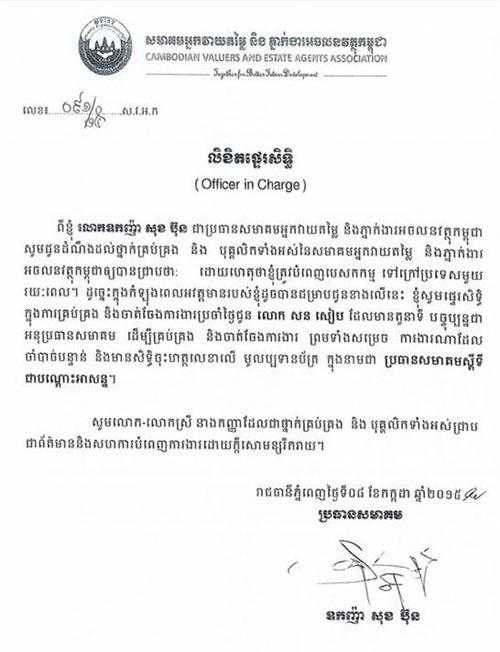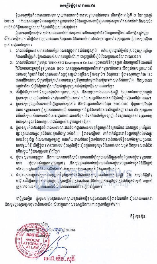 សូមបញ្ជាក់ថា នៅថ្ងៃទី១៤ ខែកក្កដា ឆ្នាំ២០១៥នេះ ឧកញ៉ា សុខ ប៊ុន បានចេញសេចក្ដីបំភ្លឺជូនសាធារណៈជន និងលិខិតសុំទោស មកលើកញ្ញាសាសា ដោយក្នុងលិខិតដ៏កម្រនោះបានបង្ហាញពី ការលះបង់៖ ទី១-លាឈប់ពីប្រធានសមាគមវាយតម្លៃអចលនវត្ថុ ។ ទី២-លាឈប់ ពីនាយកក្រុមហ៊ុន TEHO-SBG Developement Co.,Ltd លើគម្រោង វិនិយោគវិស័យអចលនទ្រព្យចំនួនប្រមាណ ៥០០លានដុល្លារ និងទី៣-ខ្លួនបានលើកឡើងថា ដើម្បីជាកិច្ចគោរពជាទីសក្ការៈ ជូនចំពោះព្រះមហាក្សត្រ និងសម្ដេច តេជោនាយករដ្ឋមន្ដ្រី នៃព្រះរាជណាចក្រកម្ពុជាខ្លួនសុំលាឈប់ពីមុខងារជាឧកញ៉ាចាប់ពីថ្ងៃនេះតទៅ ។