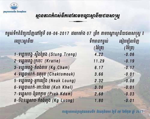 ភ្នំពេញ ៖ ស្ថានភាពកំពស់ទឹកតាមស្ថានីយជលសាស្ត្រ នាព្រឹកថ្ងៃទី ០៨ ខែមិថុនា ឆ្នាំ ២០១៧ ដែលមហាជនគួរតែដឹង ។