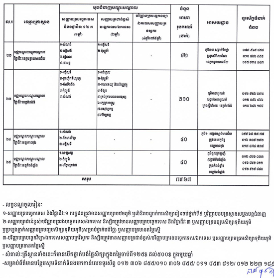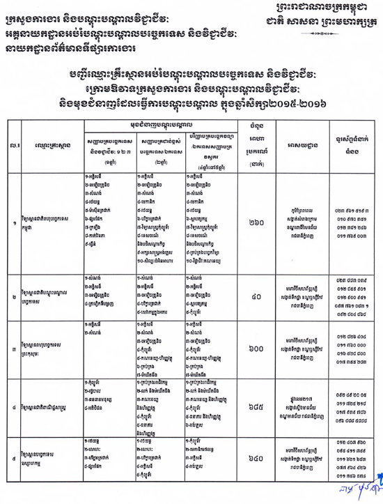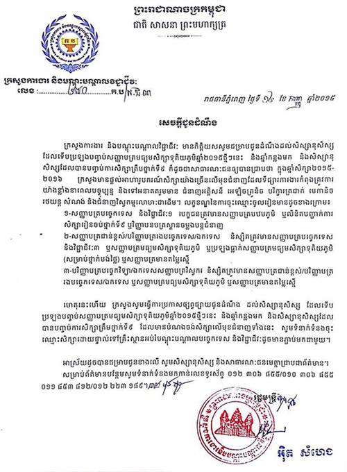 ភ្នំពេញ៖ រដ្ឋមន្ត្រីក្រសួងការងារ និងបណ្តុះបណ្តាលវិជ្ជាជីវៈ លោក អ៉ិត សំហេង នៅថ្ងៃទី១៤ ខែកញ្ញានេះ បានចេញសេចក្តីជូនដំណឹងមួយ ដើម្បីប្រកាសដល់សិស្ស ដែលទទួលបានជោគជ័យ និងមិនជោគជ័យ នៃការប្រឡងបាក់ឌុបឆ្នាំ២០១៥ ឬឆ្នាំកន្លងទៅ ក៏ដូចជាសិស្សប្រឡងធ្លាក់ ឬជាប់ថ្នាក់ទី៩ ពួកគាត់មានឱកាស ទទួលបានអាហារូបករណ៍ សិក្សានៅវិទ្យាស្ថាន ឬមជ្ឈមណ្ឌលនានា ទាំង២៥ ដែលចំណុះកឲ្យក្រសួងការងារ និងបណ្តុះបណ្តាលវិជ្ជាជីវៈ។