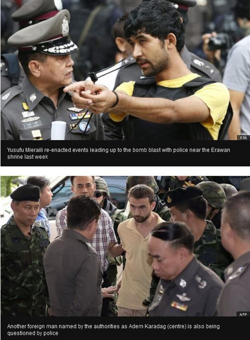 យ៉ាងណាមិញ ប្រភពសារព័ត៌មាន ប៊ីប៊ីស៊ី បន្តចុះផ្សាយអោយដឹងថា ងាកក្រឡេក ទៅមើលរដ្ឋាភិ បាលប្រទេសថៃ ឯណោះវិញ បានចាប់ ឃាត់ខ្លួន ជន សង្ស័យបំផ្ទុះគ្រាប់បែ ក បាន ២ រូបហើយ ខណៈកំពុងតែតាមប្រមាញ់ជនសង្ស័យ ជនទី ៣ ដែល មានជំនឿជាក់ថា មានវត្តមានមកពីខេត្ត ស៊ីនជាំង ប្រទេសចិន ។
