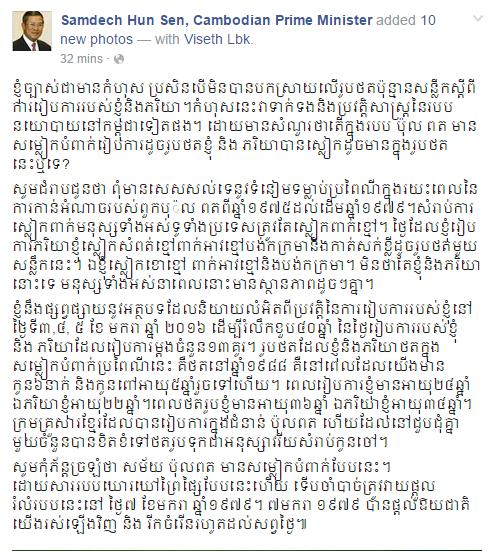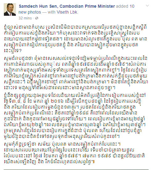 ព័ត៌មានជាតិ៖ ថ្មីៗនេះប្រមាណជា ១៥នាទីមុន សម្ដេចតេជោ ហ៊ុន សែន នាយករដ្ឋមន្ដ្រីនៃប្រទេសកម្ពុជា បានស្រាយបញ្ជាក់ទៅលើរូបថតអាពាហ៍ពិពាហ៍ ប៉ុន្មានសន្លឹករបស់សម្ដេច ក្រោយពីមានការចាប់អារម្មណ៍ខ្លាំងពីបណ្ដាសង្គមអ្នកលេង ហ្វេសប៊ុក តាមរយៈ Page ផ្លូវការរបស់សម្ដេចផ្ទាល់ ។ ខាងក្រោយជា សេចក្ដីពន្យល់យ៉ាងជាក់ច្បាស់ ចៀសវាងក្រែងមានការភាន់ច្រលំ៖