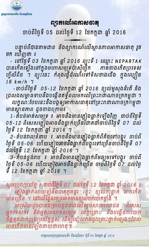 (ភ្នំពេញ)៖ ក្រសួងធនធានទឹក និងឧតុនិយម នៅថ្ងៃទី០៤ ខែកក្កដានេះ បានព្យាករណ៍ពីអាកាសធាតុរបស់កម្ពុជា ដោយបញ្ជាក់ថា ប្រទេសកម្ពុជាចាប់ពីថ្ងៃទី០៥ ដល់ទី១២ ខែកក្កដា ឆ្នាំ២០១៦ នឹងទទួលរងសម្ពាធទាប ព្យុះឈ្មោះ Nepartak ដែលបង្កឲ្យមានភ្លៀង ធ្លាក់ច្រើន លាយឡំនឹងខ្យល់កន្ត្រាក់ ផ្គររន្ទះផងដែរ។ ពិសេសនៅលើផ្ទៃសមុទ្រអាច មានខ្យល់បក់បោកខ្លាំង។