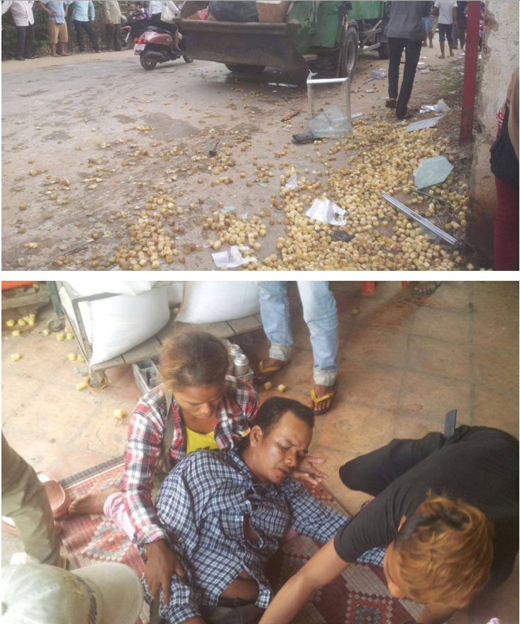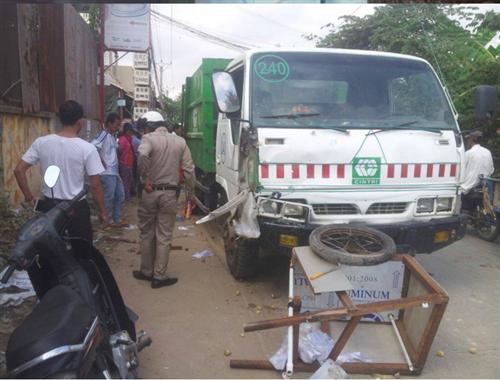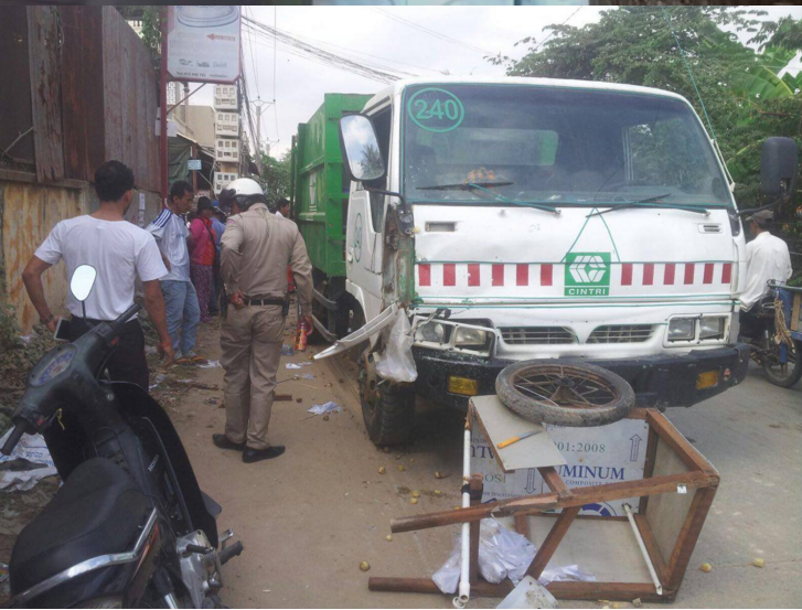 មន្ត្រីសមត្ថកិច្ចបានឲ្យដឹងថា មុនកើតហេតុ គេឃើញរថយន្ដដឹកសម្រាមរបស់ក្រុមហ៊ុន CINTRI បើកបរនិងជិះមានគ្នា៤នាក់ ស្របទិសគ្នា ជាមួយម៉ូតូសង់កូរ៉េនិងថ្មើជើងម្នាក់រុញរទេះ លក់អំពៅសាងពីលិចមកកើតដោយអ្នកបើកបរ រថយន្ដមានការ ធ្វេសប្រហែស ជាប់ប្រឡែងគ្នាជាន់ហ្វ្រាំងមិនជាប់បានជ្រុលចង្កូត ទៅបុកម៉ូតូជនរងគ្រោះពីក្រោយពេញទំហឹង បណ្ដាលឲ្យ ដួលផ្លោងបោក និងថ្នល់រងរបួសធ្ងន់។