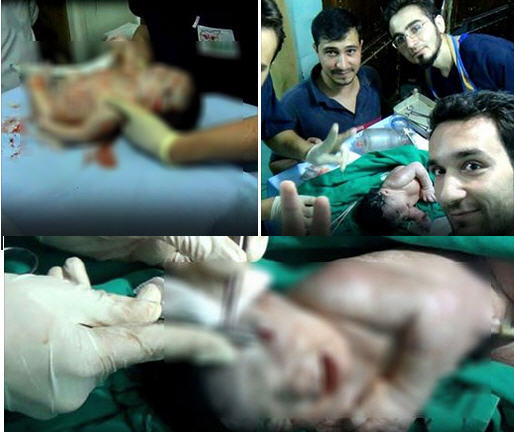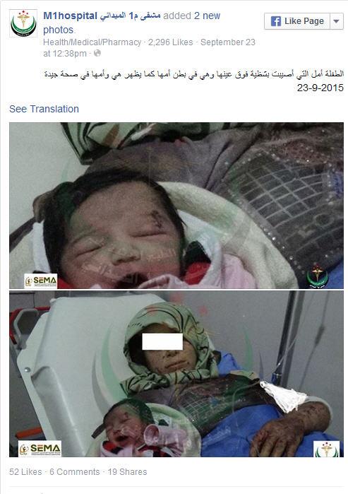យោងតាមការគូសបញ្ជាក់ដោយផ្ទាល់ពីសំណាក់ ក្រុមវេជ្ជបណ្ឌិតអោយដឹងថា ទារិកាតូចខាងលើ រងរបួសស្រាលតែប៉ុណ្ណោះ ខណៈស្រ្តីជាម្តាយរងរបួសធ្ងន់ ទទួលរង បំណែកកំទេចកំទី គ្រាប់បែក ចំផ្ទៃមុខ និងខ្លូនប្រាណ ខណៈបំណែកគ្រាប់បែក មួយនោះ ខ្ទាត ចាក់ចូលក្នុងពោះរបស់នាង ។ មានភាពភ័យខ្លាចជាខ្លាំង ពាក់ព័ន្ធនឹងអាយុជីវិតម្តាយកូន ក្រុមវេជ្ជបណ្ឌិត បានសម្រេច ធ្វើការវះ កាត់ភ្លាមៗ រហូតទទួលបានជោគជ័យ ។ ជាមួយ នឹងសន្លឹក រូបថត ( photos ) បង្ហោះផ្សាយ នៅ ទំព័រហ្វេសប៊ុក បង្ហាញអោយដឹងថា ទារិកាតូច ត្រូវ បានគេវះ កាត់ចេញពី ពោះម្តាយ ជាមួយនឹង បំណែក គ្រាប់បែក ជាប់នឹងថ្ងាសរបស់នាងតូច ។