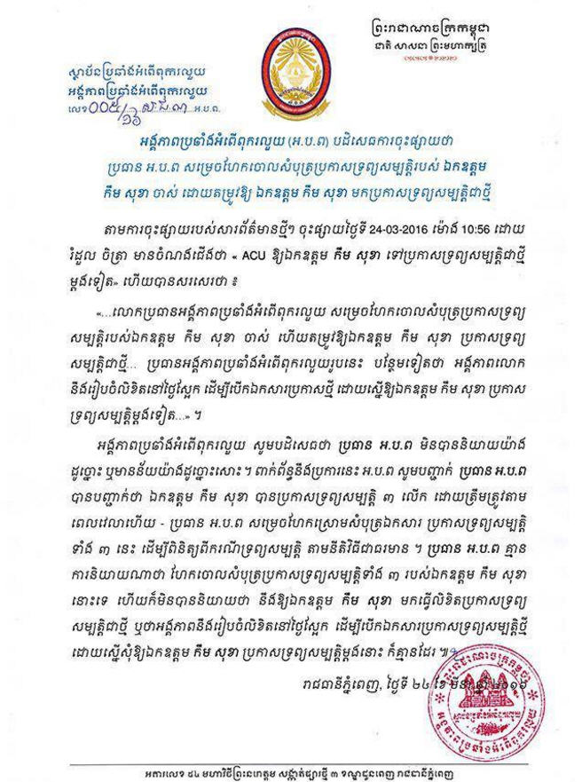 យោងតាមលិខិតរបស់អង្គភាពប្រឆាំងអំពើពុករលួយ បានឲ្យដឹងថា៖ «សារព័ត៌មានថ្មីៗ ចុះផ្សាយនៅថ្ងៃទី២៤ ខែមីនា នៅម៉ោង១០៖៥៦នាទី ដោយអ្នកសរសេរឈ្មោះ រំដួល ចិត្រា បានសរសេរថា ACU ឲ្យ កឹម សុខា ទៅប្រកាសទ្រព្យសម្បត្តិជាថ្មីម្តងទៀត, ដោយលោកប្រធានអង្គភាពប្រឆាំង អំពើពុករលួយ សម្រេចហែកចោលសំបុត្រប្រកាសទ្រព្យសម្បត្តិរបស់ ឯកឧត្តម កឹម សុខា ចាស់ ហើយតម្រូវឲ្យឯកឧត្តម កឹម សុខា ប្រកាសទ្រព្យសម្បត្តិជាថ្មី»។