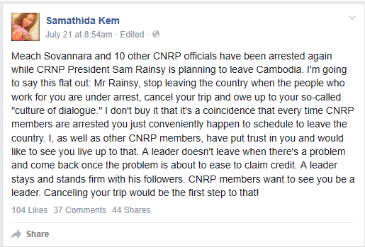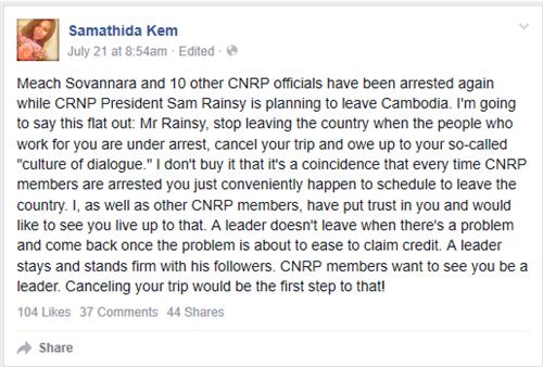 អ្នកស្រី កឹម សម្មាធីតា បានសរសេរជាភាសាអង់គ្លេស នៅលើ Facebook ថា "ខ្ញុំមិនជឿថា វាជារឿងចៃដន្យទេ រាល់ពេលដែលសមាជិកគណបក្សសង្គ្រោះជាតិ ត្រូវបានចាប់ខ្លួន លោករៀបចំចាកចេញពីប្រទេសយ៉ាងងាយស្រួល។ ខ្ញុំក៏ដូចជា សមាជិកគណបក្សសង្គ្រោះជាតិដទៃទៀត បានដាក់ការទុកចិត្តនៅលើលោក…មេដឹកនាំ គឺមិនចាកចេញនៅពេលដែលមានបញ្ហា ហើយនិងត្រឡប់មកវិញ នៅពេលដែលបញ្ហានោះ ត្រូវបានបន្ធូរបន្ថយ ហើយធ្វើការអះអាងទាមទារយកស្នាដៃទេ"។