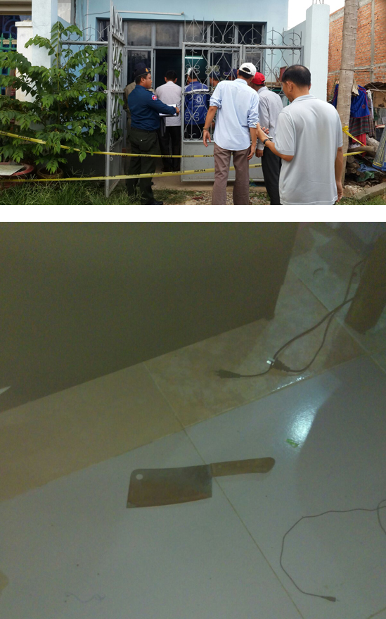 មន្រ្តីអាវុធហត្ថបានបន្តថា នៅវេលាម៉ោងកើតខាងលើ មានអ្នកជិតខាង ព្រឹកឡើងមិនឃើញ ចេញពីផ្ទះក៏ដើរ មកហៅ មិនឮឆ្លើយក៏ចូលក្នុងផ្ទះរកមើល ឃើញជនរងគ្រោះដេកស្លាប់ ក្នុងបន្ទប់ទឹកដោយមាន ស្នាមអាកនឹង កាំបិតបង័តោ ពេលកើតហេតុប្តីជនរងគ្រោះមិននៅកន្លែងកើតហេតុទេ ។