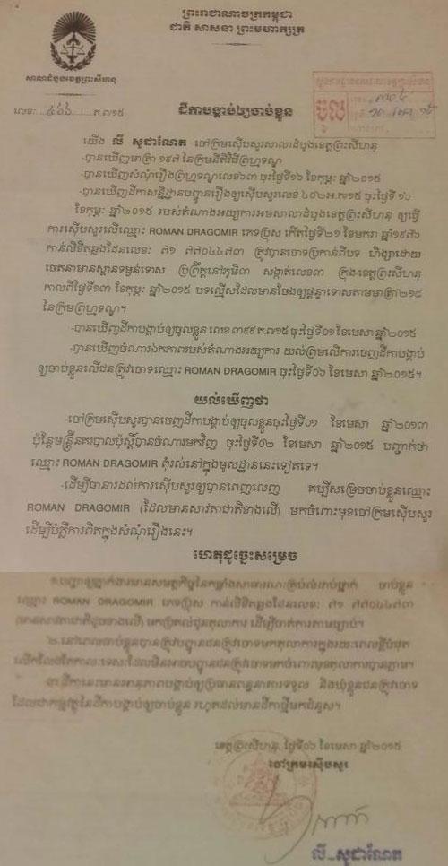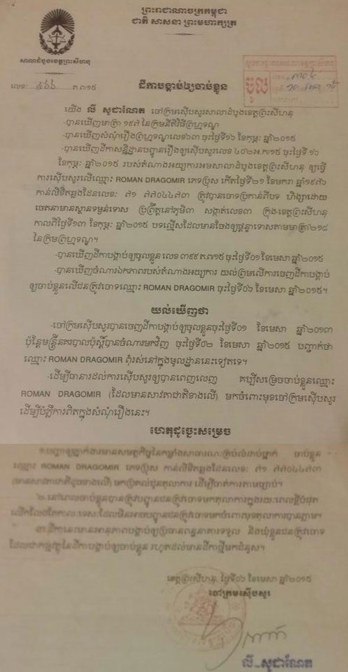 បុរសជនជាតិរុស្សី មានឈ្មោះ Roman Dragomir អាយុ៤០ឆ្នាំ ត្រូវបានលោក លី សូដាណែត ចៅក្រមសើបសួរ សាលាដំបូងខេត្តព្រះសីហនុ ចេញដីកាចាប់ខ្លួន កាលពីថ្ងៃទី៦ ខែមេសា ឆ្នាំ២០១៥ ក្រោមបទចោទប្រកាន់ ហិង្សាដោយចេតនា ដោយមានស្ថានទម្ងន់ទោស ប្រព្រឹត្តទៅ នៅភូមិ៣ សង្កាត់លេខ៣ ក្រុងព្រះសីហនុ កាលពីថ្ងៃទី១៣ ខែកុម្ភ: ឆ្នាំ២០១៥ ៕
