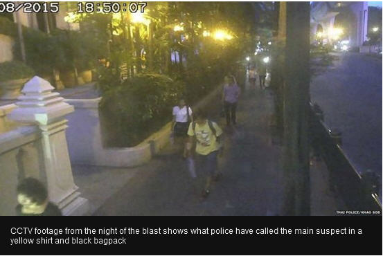 មន្រ្តីប៉ូលីស របស់ប្រទេសថៃ បានចេញផ្សាយនូវរូបគំនូរព្រាង មុខ ជន សង្ស័យ ក៏ដូចជា ឃ្លីបវីដេអូ ខណៈក្រុមការងារ មានជំនឿជាក់អោយដឹងថា ជនសង្ស័យគឺជាជនបរទេស និង ធ្វើការងារជាក្រុម ពាក់ព័ន្ធនឹងការបំផ្ទុះ លើកនេះ ។ គួររំឮកថា អំឡុងថ្ងៃព្រហស្បត្តិ៍កន្លងទៅនេះ អាជ្ញាធរ ប្រទេសថៃ ប្រកាសផ្តល់ប្រាក់រង្វាន់ ១លានបាត ដល់បុគ្គលណាមួយ ដែល ផ្តល់ នូវព័ត៌មានលម្អិត ឈានទៅ ចាប់ឃាត់ខ្លួន ជនសង្ស័យរូបនេះ តែបច្ចុប្បន្នភាព ថៃ ប្រកាស បង្កើនប្រាក់រង្វាន់ ត្រីគុណ ពោល ពី ១លានបាត ទៅជា ៣លានបាត ស្មើនឹង ៨៤,០០០$៕