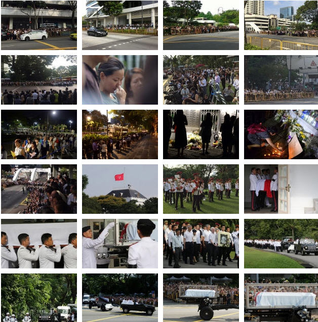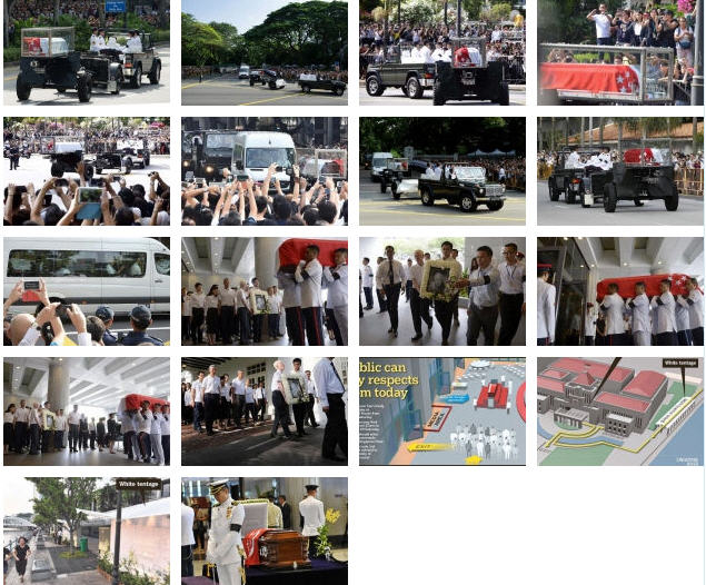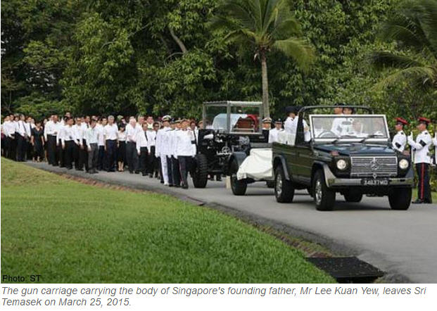 សិង្ហបុរី ៖ នៅថ្ងៃពុធ ទី២៥ ខែមីនា ឆ្នាំ២០១៥នេះ ក្រុមរថពាសដែក និងយោធាកាំភ្លើងធំ របស់ប្រទេសសិង្ហបុរី បាន ធ្វើការដឹកជញ្ជូនមឈូស តម្តល់សពរបស់អតីត បិតាស្ថាបនិក លី ក្វាន់យូ ដែលបានទទួលមរណៈភាព កាលពីដើម សប្តាហ៍នេះ ពីវិមានអ៊ីស្តាណា ទៅកាន់ វិមានរដ្ឋសភាជាតិ ដើម្បីបន្តនូវពិធីបុណ្យសព ដែលកំពុងទទួលការចាប់ អារម្មណ៍បំផុត នៅលើសកលលោកនេះ ។