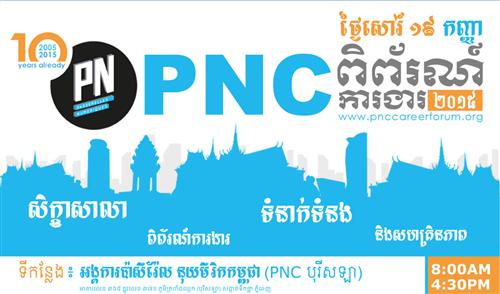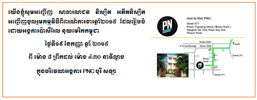 ភ្នំពេញ - អង្គការប៉ាសឺរែលនុយមេរិក កម្ពុជា (PNC) មានសេចក្តីសោមនស្សរីករាយ ក្នុងការបើក ទ្វារ នៃបរិវេណរបស់ខ្លួន សម្រាប់ព្រឹត្តិការណ៍ពិពរណ៍ ការងារ ប្រចាំឆ្នាំ២០១៥ ដែលនឹង ប្រព្រឹត្ត ទៅនៅថ្ងៃ សៅរ៍ទី១៩ ខែកញ្ញា ឆ្នាំ២០១៥ ចាប់ពីម៉ោង ៨ ព្រឹក ដល់ម៉ោង ៤:៣០ នាទីល្ងាច នេះ ជាឱកាសដ៏ល្អមួយសម្រាប់អង្គការប៉ាសឺរែលនុយមេរិក កម្ពុជា ដើម្បី ស្វាគមន៍ក្រុមហ៊ុនជា ដៃគូ របស់ខ្លួនដើម្បីដាក់តាំងបង្ហាញពីឱកាសការងារ ដែល ពួកគេមាន និងជាឱកាស សម្រាប់ មហា ជន ទូទៅជាពិសេសនិស្សិតដែលកំពុងសិក្សា ឬត្រៀមបញ្ចប់កា រសិក្សាលើ ជំនាញផ្សេងៗ បាន ជួប ជាមួយ នាយោជកដោយផ្ទាល់ ដើម្បីស្វែងយល់ អំពីលក្ខណ្ឌ ចាំ បាច់ នានា ដែលជាតម្រូវ ការរបស់ទីផ្សារការងារបច្ចុប្បន្ន ហើយក៏ជាឱកាសសម្រាប់អ្នកចូលរួម បានស្តាប់ និង សិក្សា ពី បទពិសោធន៍ ទស្សនៈជោគជ័យនានាដែលនឹងចែក រំលែកដោយវាគ្មិនកិត្តិយសល្បីៗ ជាច្រើរូប ដែលអញ្ជើញមកពីបណ្តាលក្រុមហ៊ុនធំៗនៅក្នុងប្រទេសកម្ពុជា។