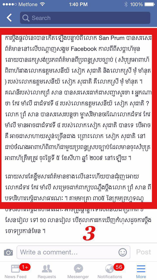 កាលពីខែសីហា កន្លងទៅ Facebook របស់លោក ព្រំ សាន ដែលដកស្រង់ប្រភពព័ត៌មាន ពីអតីតភរិយា របស់លោកឧត្តមសេនីយ៍ សៀក សុជាតិ គឺលោកស្រី មុំ ម៉ានុត បានសរសេរដាក់ជាសញ្ញាសួរថា៖ អ្នកណា ថា កែវ ម៉ាលី ជាជំទាវទី៤ របស់លោកឧត្តមសេនីយ៍ សៀក សុជាតិ? លោក ព្រំ សាន បានសរសេរបន្តថា ម្ចាស់វិមានចរណៃលោកជំទាវ កែវ ម៉ាលី មិនអាចជាជំទាវទី៤ របស់លោកសៀក សុជាតិ បានទេ បើអាចគឺអាចជាសាហាយស្មន់ច្រើនជាង ព្រោះលោក សៀក សុជាតិ នៅជាប់ចំណងអាពាហ៍ពិពាហ៍ ជាមួយប្រពន្ធស្របច្បាប់ ដែលមានចុះសំបុត្រអាពាហ៍ពិពាហ៍ត្រឹមត្រូវ ចុះថ្ងៃទី០៥ ខែសីហា ឆ្នាំ២០០៩ នៅឡើយ៕
