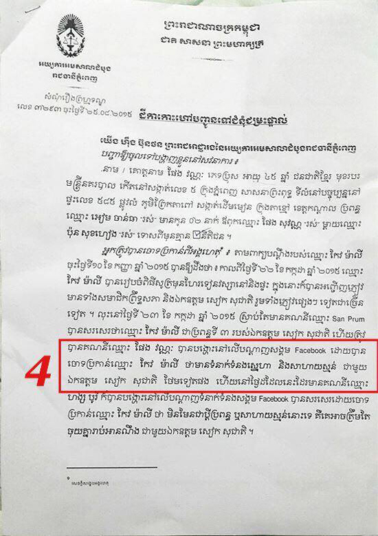 សូមជំរាបថា ចំពោះរឿងនេះ សាលាដំបូងរាជធានីភ្នំពេញ កាលពីថ្ងៃទី២៦ ខែតុលា បានសម្រេចឱ្យ លោក ព្រំ សាន្ត អនុប្រធាននាយកដ្ឋានព័ត៌មាន នៃក្រសួងព័ត៌មាន និងលោកស្រី មុំ ម៉ានុត អតីតភរិយាលោកឧត្តមសេនីយ៍ សៀក សុជាតិ នាយរងសេនាធិការចម្រុះ និងនាយកទីចាត់ការព្រំដែន ក្រសួងការពារជាតិ សងជំងឺចិត្តទៅលោកស្រី កែវ ម៉ាលី សមាជិកព្រឹទ្ធសភាម្នាក់ៗ ១០លានរៀល រួមទាំងពិន័យប្រាក់ ចំនួន ៥លាន រៀលសម្រាប់បង់ចូលរដ្ឋ ។