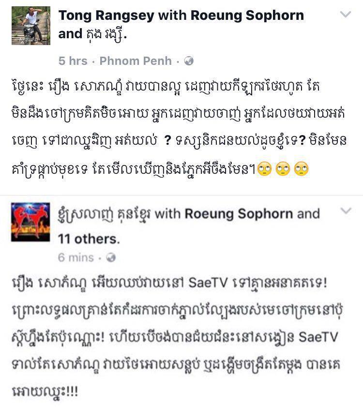 (ភ្នំពេញ)៖ ដោយមិនសុខចិត្តនឹងការផ្ដល់ពិន្ទុឲ្យចាញ់កីឡាករថៃ Keng Kat ក្នុងជំនួបដណ្ដើមខ្សែក្រវាត់លើសង្វៀនអាស៊ីអាគ្នេយ៍ (Sea-TV) កាលពីល្ងាចថ្ងៃទី១៧ ខែធ្នូ ឆ្នាំ២០១៦ អ្នកលេងកណ្ដាប់ដៃ រឿង សោភ័ណ្ឌ បានកើតទុក្ខមិនសុខចិត្តចំពោះលទ្ធផលនេះឡើយ ហើយថែមទាំងបង្ហោះវីដេអូលើ Facebook ផ្ទាល់ខ្លួនក្រោយចប់ការប្រកួត ដោយព្រមានលាឈប់ពីអាជីពជាអ្នកប្រដាល់ ប្រសិនបើសហព័ន្ធកីឡាប្រដាល់កម្ពុជា មិនដោះស្រាយរឿងអយុត្ដិធម៌ខាងលើដល់ខ្លួនទៀតផង។